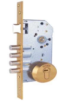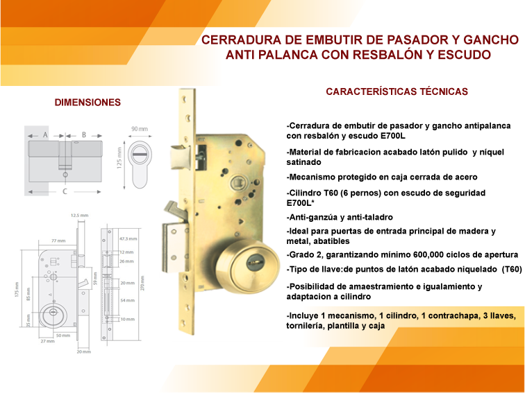 Cerradura de embutir de pasador y gancho anti palanca con resbalón y escudo