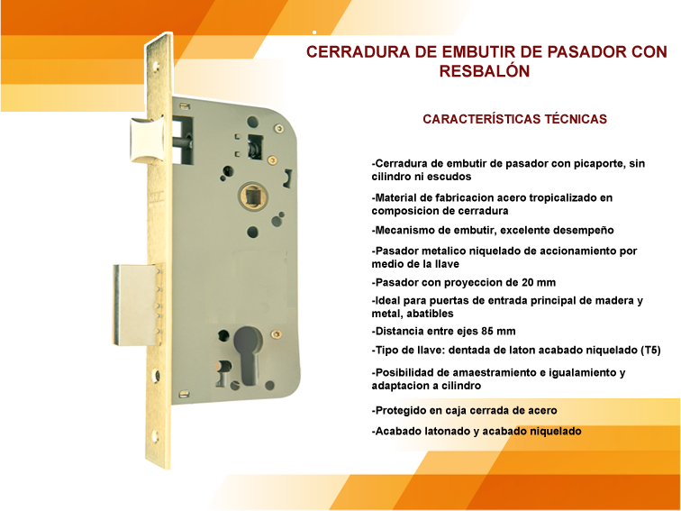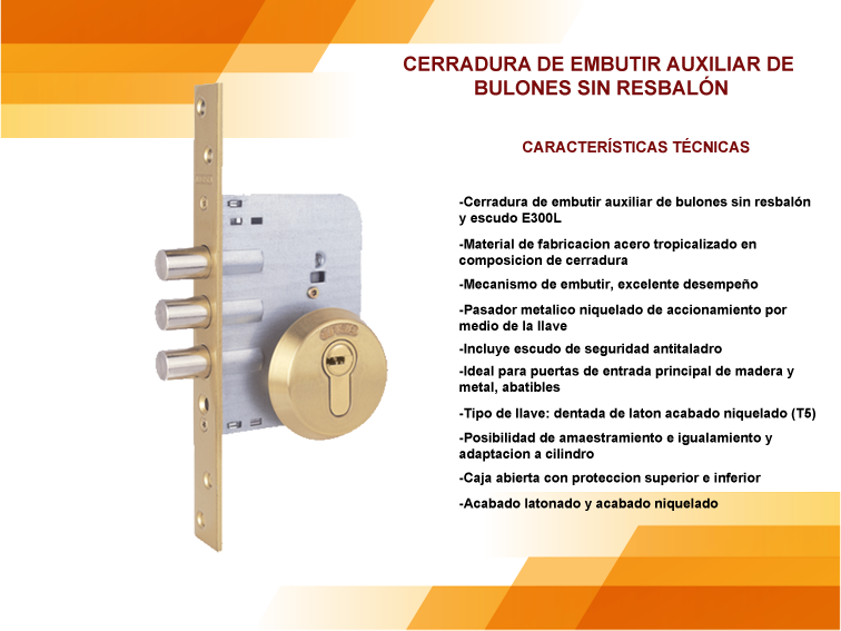 Cerradura de embutir auxiliar de bulones, sin resbalón