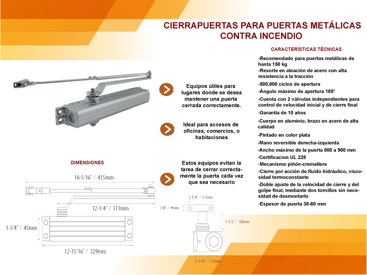 Cierrapuertas para puertas metálicas contra incendio hasta 150 kg.