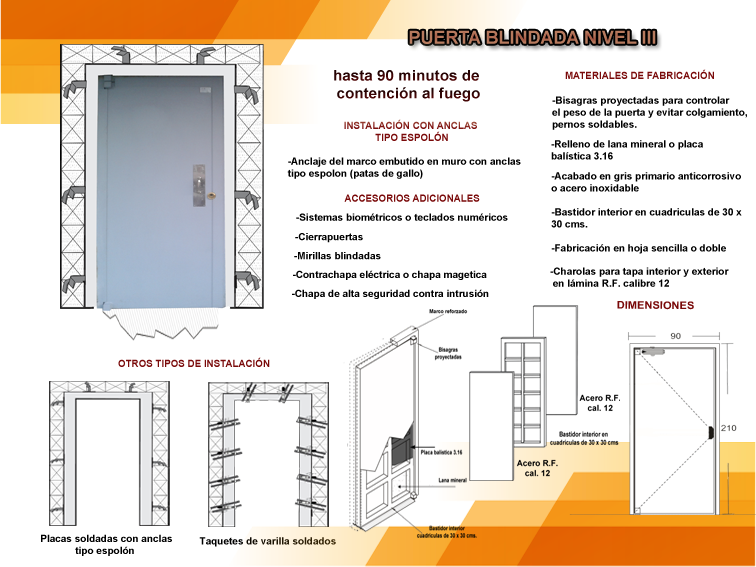 Incluye: marco blindado, bisagras especiales proyectadas, chapa de alta seguridad y manijas.