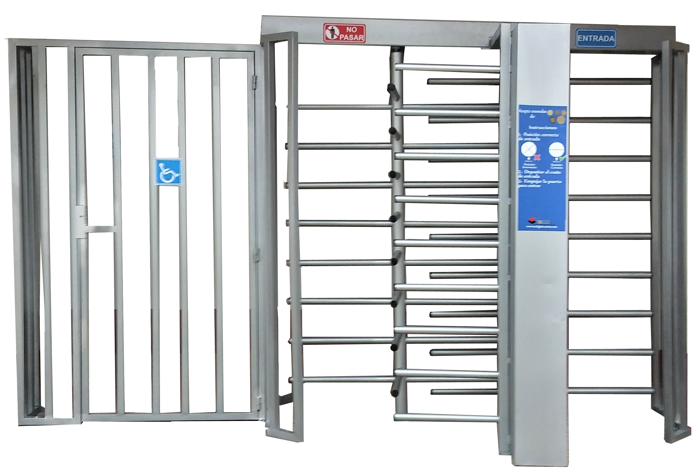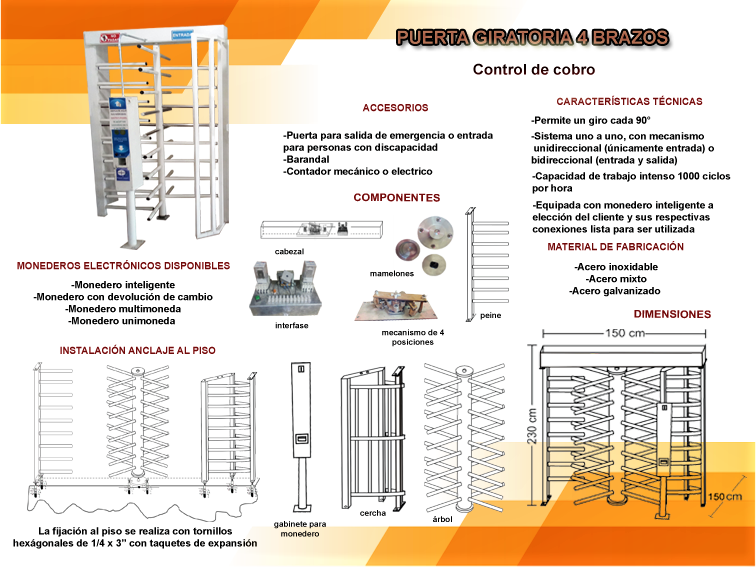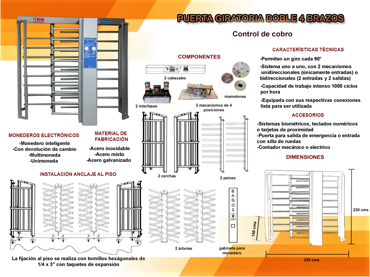 PARA CONTROL DE COBRO: Estas puertas están fabricadas en cuatro brazos para mayor control en el ingreso. Cuentan con mecanismo uno a uno, es decir al ingresar la cantidad de cobro programado permite la entrada a una sola persona, bloqueando de manera inmediata el paso a la siguiente. Están equipadas conjuntamente con alguno de nuestros tragamonedas electrónico (monedero inteligente, con devolución de cambio, multimoneda o unimoneda) según necesidades del cliente. De acuerdo al tipo de puerta ya sea sencilla o doble, es como actúa su sistema direccional.