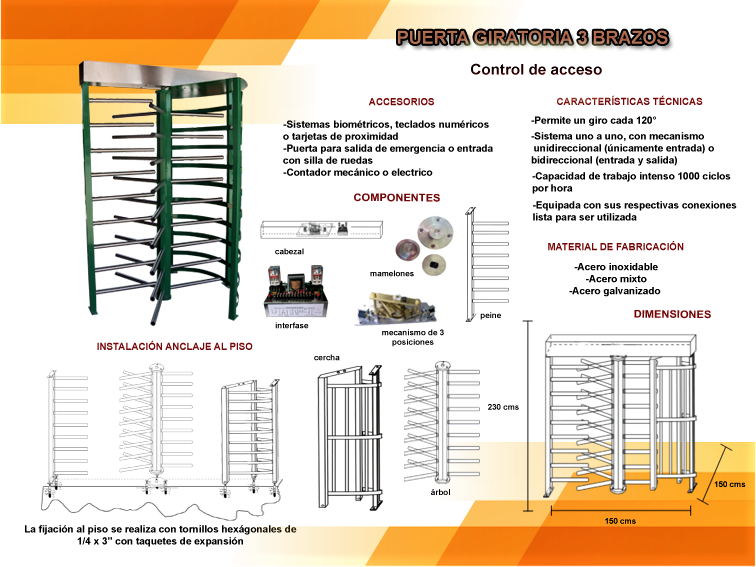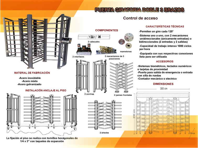 PARA CONTROL DE ACCESO PEATONAL: Son la mejor solución en el mercado para el control de acceso peatonal en espacios públicos o privados donde se desea restringir el acceso de algún usuario a un área especifica mediante la identificación por diferentes tipos de lectura, así como para evitar aglomeraciones teniendo mayor orden en el acceso mediante diseño de tres brazos. Instaladas principalmente en centros comerciales, edificios corporativos, fábricas, campus universitarios etc. De acuerdo a las necesidades de cada comprador se manejan dos tipos de sistema direccional, el cual puede ser instalado en cualquier diseño dependiendo si es sencillo o doble.
