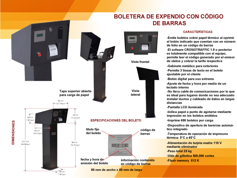 - Boletera de expendio: Funciona mediante comprobante con código de barras, proporciona un boleto al ingresar al estacionamiento