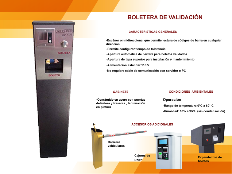 - Boletera de validación: Funciona como receptora de validación de tickets una vez que ha sido pagado el boleto, permite la salida del estacionamiento