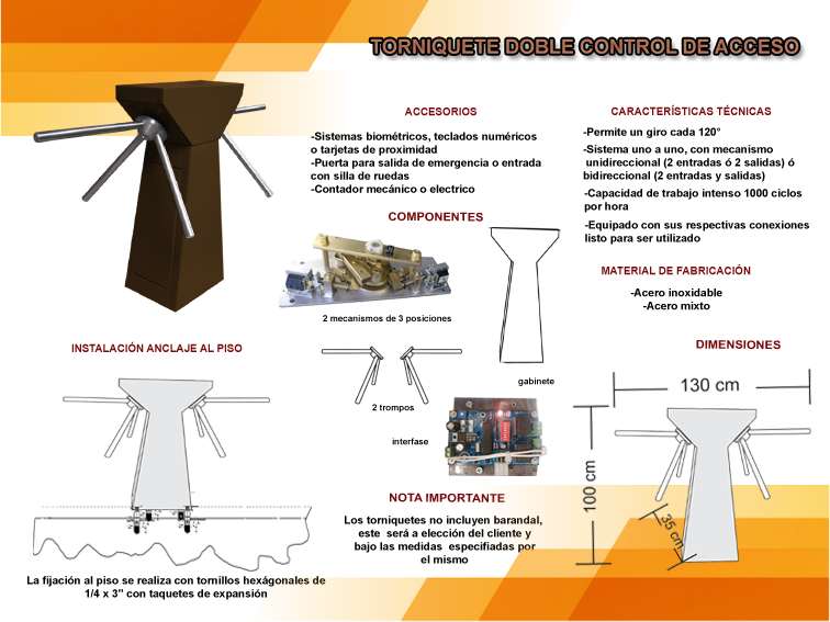 PARA CONTROL DE ACCESO PEATONAL : Son la mejor solución en el mercado para el control de acceso peatonal en espacios públicos o privados donde se desea restringir el acceso de algún usuario a un área especifica mediante la identificación por diferentes tipos de lectura, así como para evitar aglomeraciones teniendo mayor orden en el acceso mediante diseño. Instalados principalmente en centros comerciales, edificios corporativos, fábricas, campus universitarios etc. De acuerdo a las necesidades de cada comprador se manejan dos tipos de sistema direccional, el cual puede ser instalado en cualquier diseño dependiendo si es sencillo o doble.