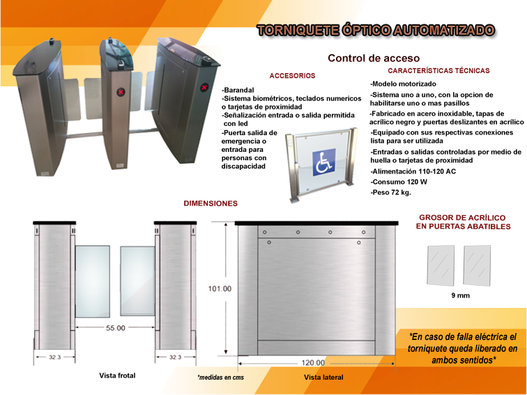 Torniquetes que permiten el acceso sin contacto, ideales para el control de tráfico o restricción, dando un aspecto mas sofisticado y elegante, ya que al momento de ingresar, se abren automáticamente y esperan a que la persona pase para poder cerrarse. Gracias a su interface nos permite que pueda ser controlada con algún tipo de control de acceso siendo las tarjetas de proximidad y equipos biométricos los ideales para este tipo de equipos.
