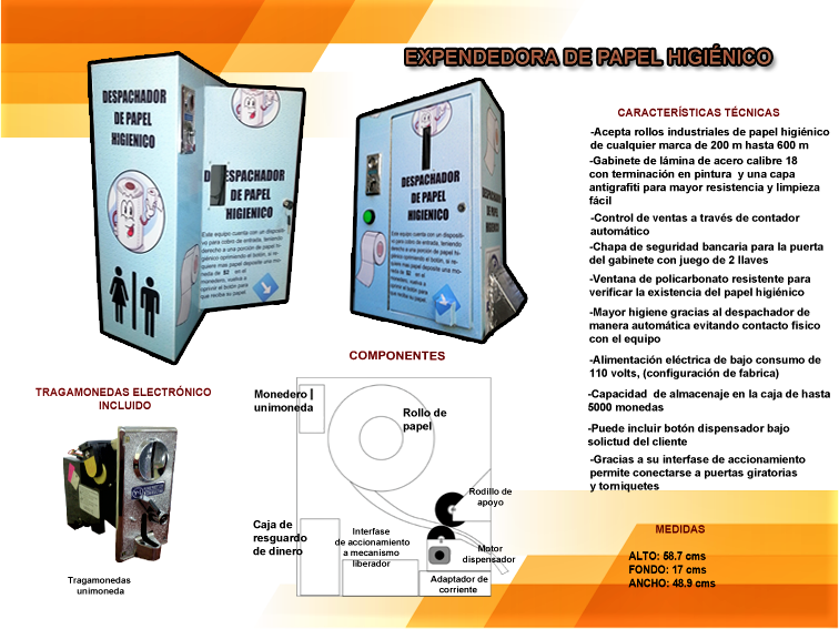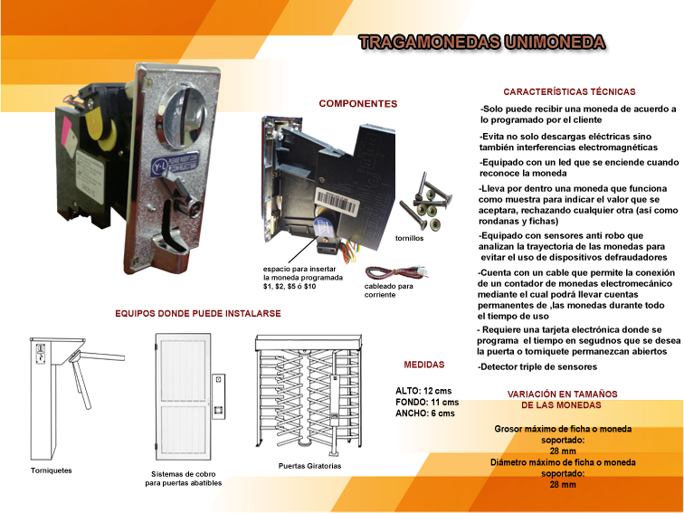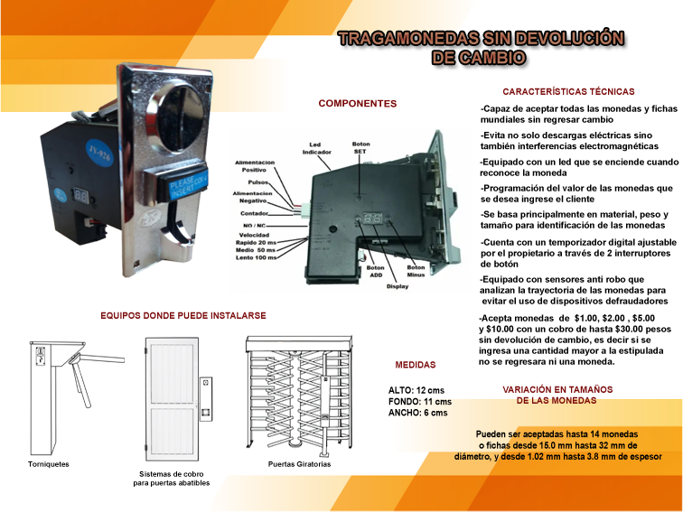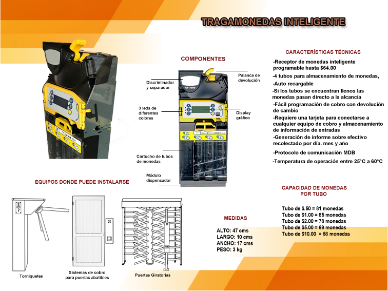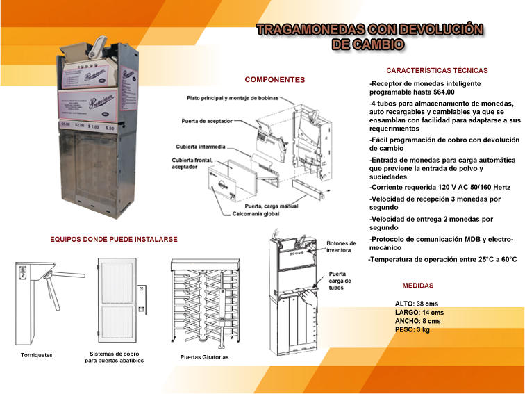 - Diseñado para recibir monedas de $.50, $1, $2, $5, $10 y fichas especiales.
