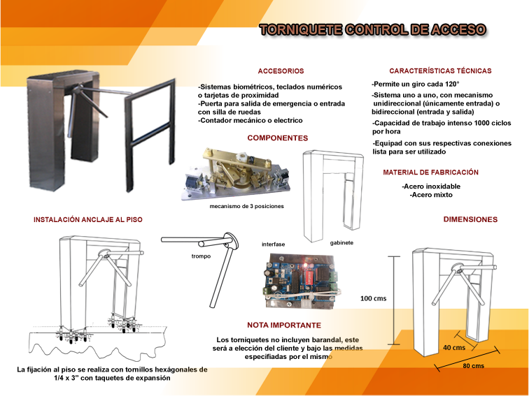 PARA CONTROL DE ACCESO PEATONAL : Son la mejor solución en el mercado para el control de acceso peatonal en espacios públicos o privados donde se desea restringir el acceso de algún usuario a un área especifica mediante la identificación por diferentes tipos de lectura, así como para evitar aglomeraciones teniendo mayor orden en el acceso mediante diseño. Instalados principalmente en centros comerciales, edificios corporativos, fábricas, campus universitarios etc. De acuerdo a las necesidades de cada comprador se manejan dos tipos de sistema direccional, el cual puede ser instalado en cualquier diseño dependiendo si es sencillo o doble.